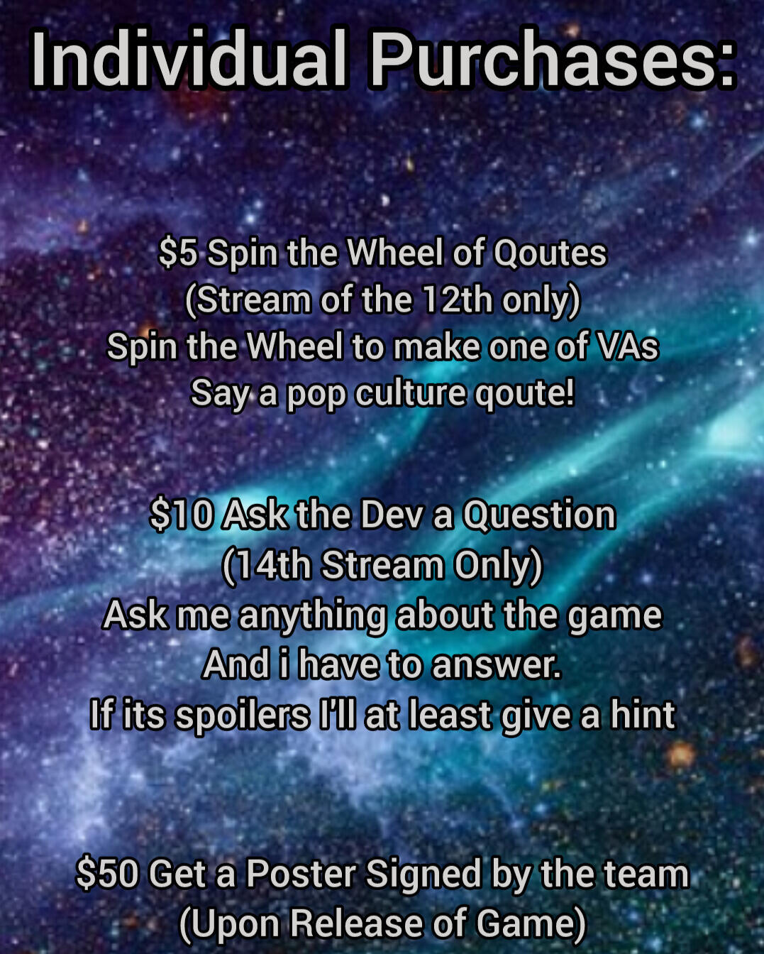Here is where we say thank you to supporters: Patreon Supporters, Those who beta tested the game, or helped in other ways!